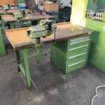 Werkbank GARANT mit Werkzeugschubladenschrank, mit Inhalt, Holzarbeitsplatte, Schraubstock LEINEN, Maße(LxBxH): 150x72x88cm, rechts Werkzeugschubladenschrank mit 5 Schubladen, Gegenstaende auf Arbeitsflaeche nicht enthalten.