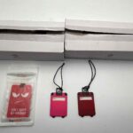 Konvolut Kofferanhänger in Kofferform, diverse Farben, in Kartons verpackt. Dazu kwmobile Kofferanhänger mit Motiv. Mit Namensfeld und Gummischlaufe.