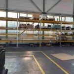 Schwerlastregal, 4 Felder, 4 Ebenen, 5 Rahmen ca. 110 x 400 cm, 32 Traversen 270 cm, gelbe Traversen, verzinkte Rahmen