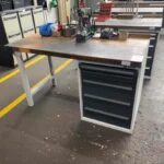 Werkbank mit Schubladenschrank, mit Inhalt, Holzarbeitsplatte, Unterbau rechts als Schubladenschrank mit 5 Schubladen, abschliessbar, Maße(LxBxH): 152x71x88cm.