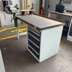 Werkbank mit Schubladenschrank und Schraubstock, mit Inhalt